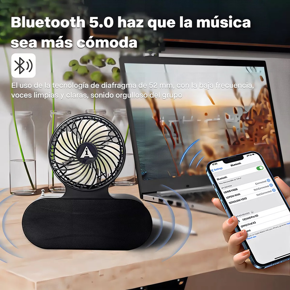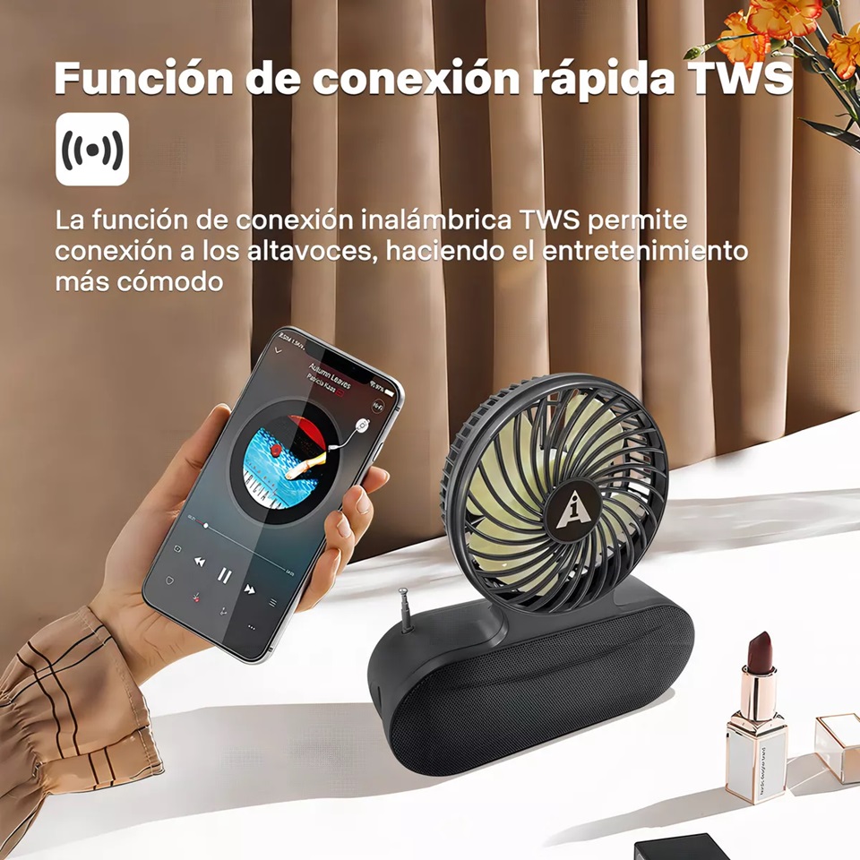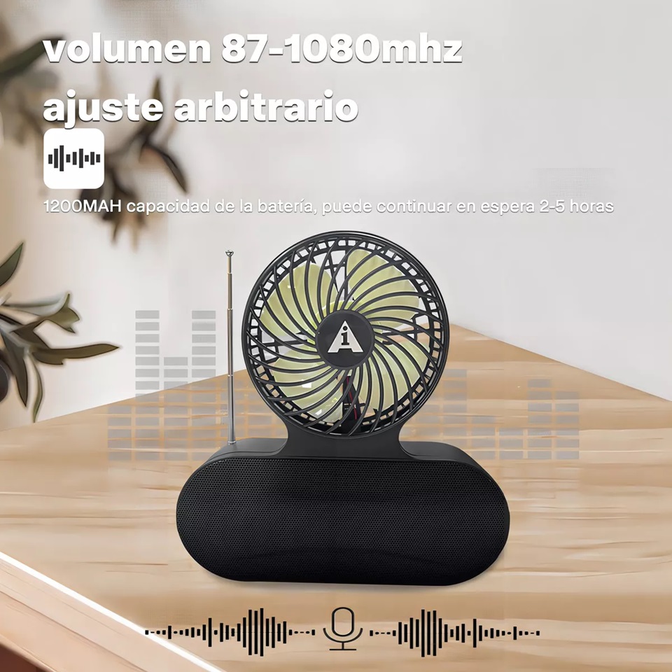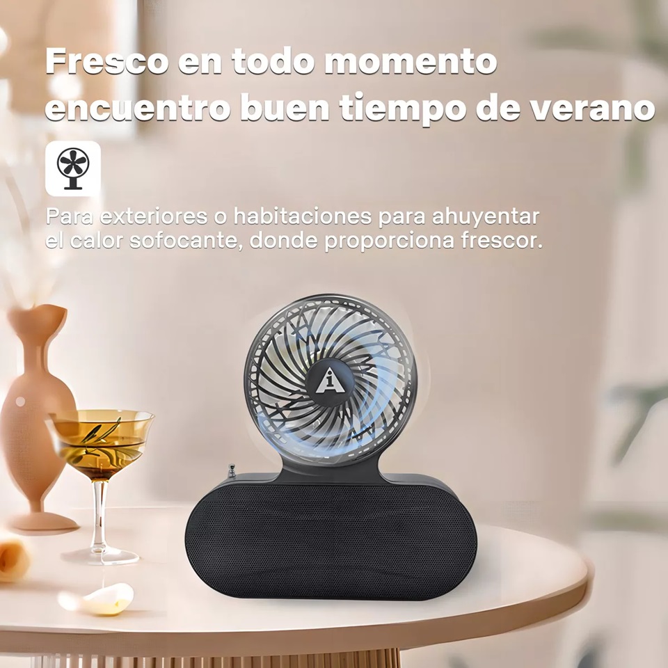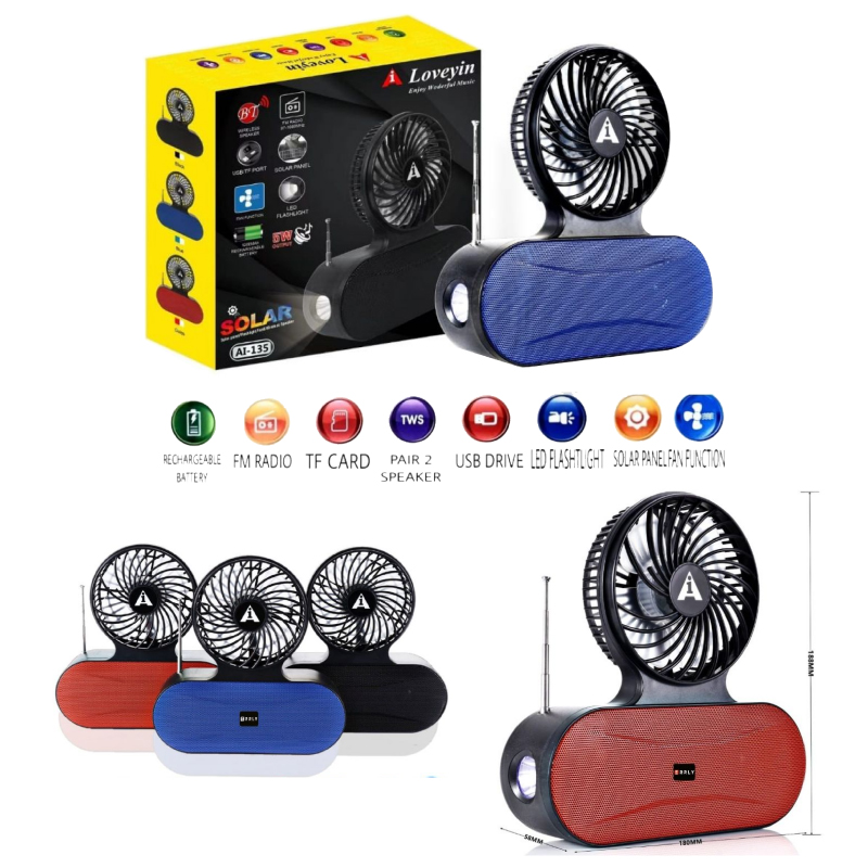 Ai-135 solar recargable, ventilador de bolsillo, altavoz bluetooth inalámbrico, es un dispositivo multifuncional con linterna solar, ventilador, radio, altavoz bluetooth, etc.