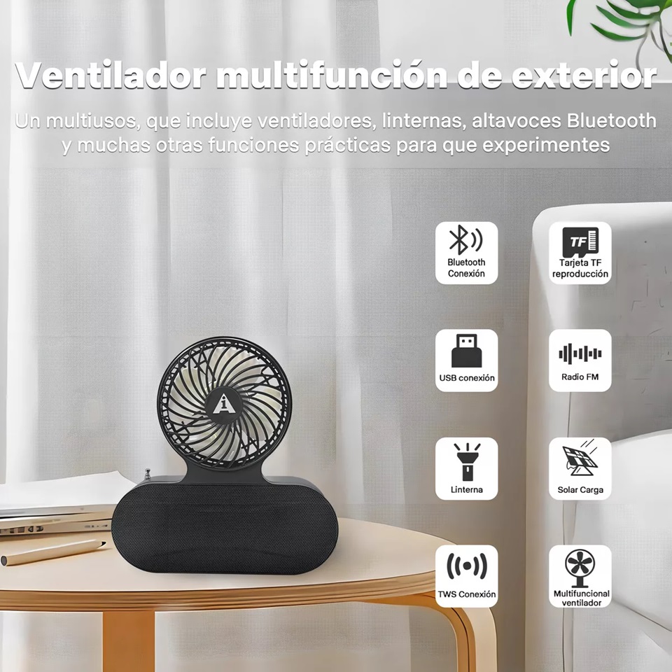 La función linterna proporciona un modo de luz brillante para las necesidades de iluminación nocturna. La función del ventilador puede proporcionar al usuario un viento fresco, especialmente adecuado para actividades al aire libre o verano caliente. La función de radio le permite escuchar programas de radio en la banda AM/FM para mantener al usuario informado de las últimas noticias y música. La función de altavoz bluetooth permite a los usuarios conectarse a un teléfono móvil u otro dispositivo a través de bluetooth para reproducir música o recibir llamadas de forma inalámbrica.